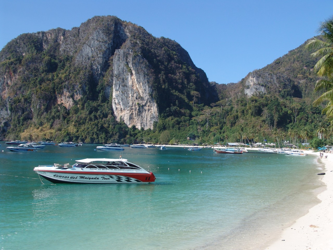 May Bay in Thailand islands Phi Ley is a minute stretch of sand. It holds beautiful scenery and it’s a quintessential Thailand beach. It is part of a small island adjacent to Ko Phi Phi. The beach is nestled in a small bay and surrounded by tall limestone cliffs. It can only be visited in day time by boat.